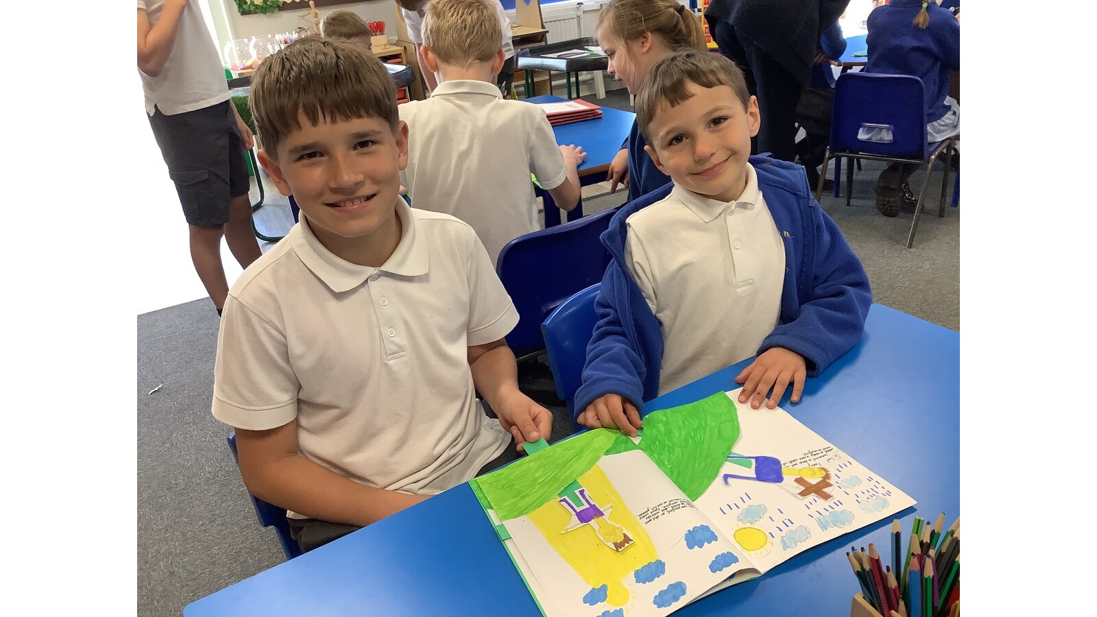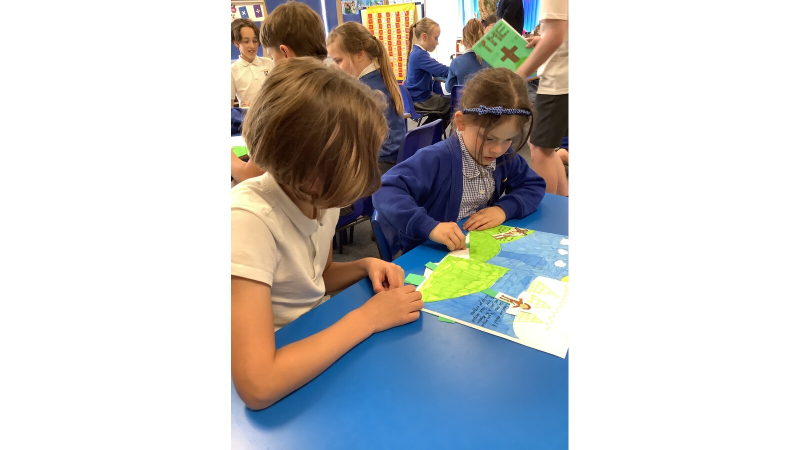 In DT this half term, Class Three learned how to plan and create a pop-up book with mechanisms. Our design brief stated that the book needed to be appropriate for children in KS1, which all of the children took into account. Since Mary Howard has been learning about Easter as part of our salvation units in RE this half term, we decided to create pop-books of the Easter story! This week, Class Three shared their finished stories with the children in Class One! Super effort!